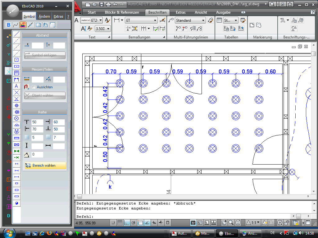 Symbole (z. B. Lampen) können so einfach in einem bestimmten Abstand zu Wänden in Zeilen und Spalten im Raum verteilt platziert werden.